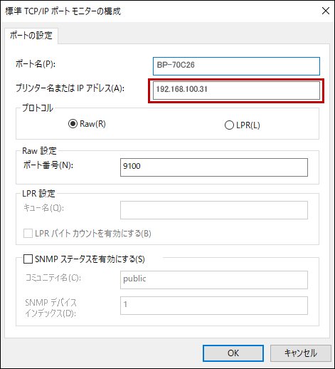 5.「標準TCP/IPポートモニターの構成」画面が表示されますので、「プリンター名またはIPアドレス(A)」に新しいプリンター名またはIPアドレスを設定しします。