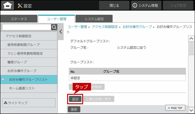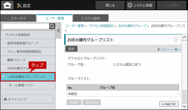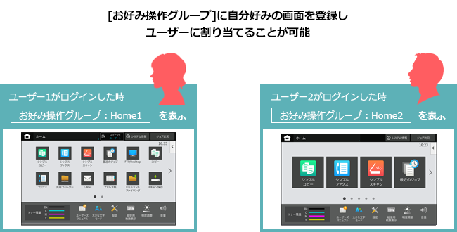 ユーザーごとに、「お好み操作グループ」を登録することで用途に合わせたお好みの画面を設定することができます。設定方法は以下の手順をご覧ください。