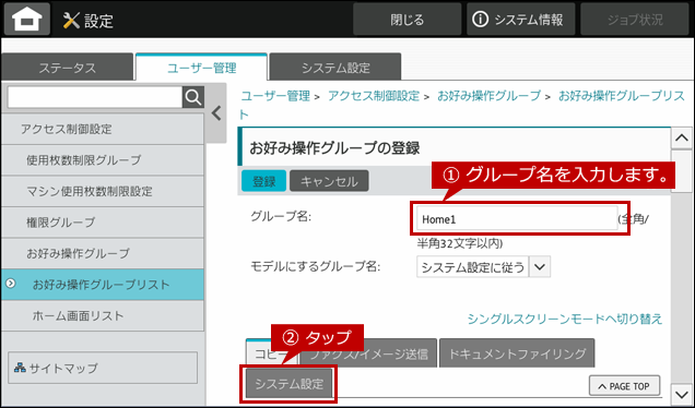 3. お好み操作グループの登録の画面が表示されますので、グループ名を入力して、[システム設定]タブをタップします。