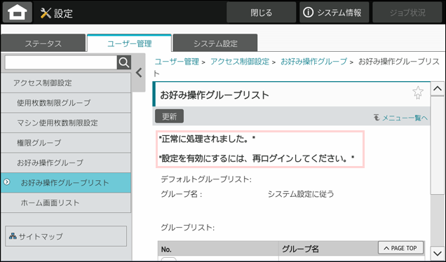 これで、お好み操作グループの登録が完了しました。次に、登録したお好み操作グループをユーザーに割り当てます。