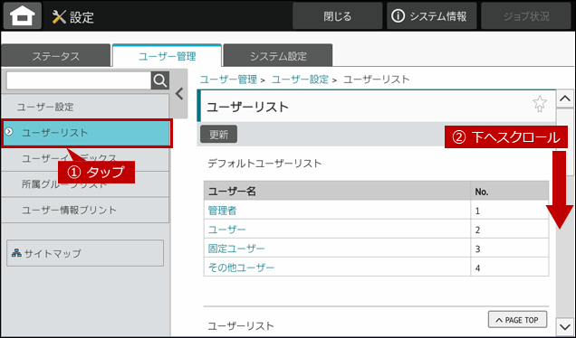 2. ユーザーリスト画面が表示されますので、[ユーザーリスト]をタップして、ページを下へスクロールします。