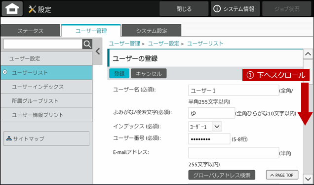 4. ユーザーの登録画面が表示されますので、ページを下にスクロールします。