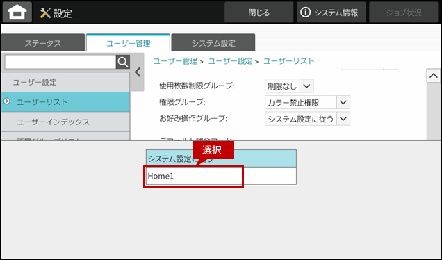 - ● ここでは、ユーザー1に「お好み操作グループ」(ホーム画面に表示するアイコンの数を12個に設定する)を割り当てる方法を記載いたします。