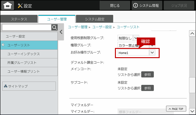 ログイン / ユーザー / ホーム画面 / マイフォルダー / お好み操作 / システム設定 / ユーザー管理