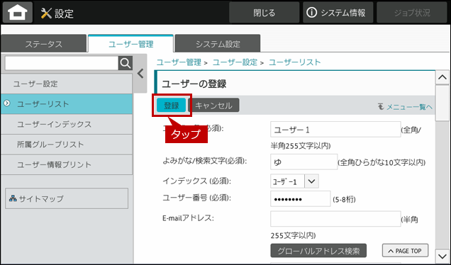 1. ユーザー管理画面で[ユーザー設定]をタップします。