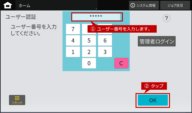 1. ユーザー認証画面でユーザー番号を入力して、[OK]をタップします。