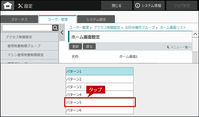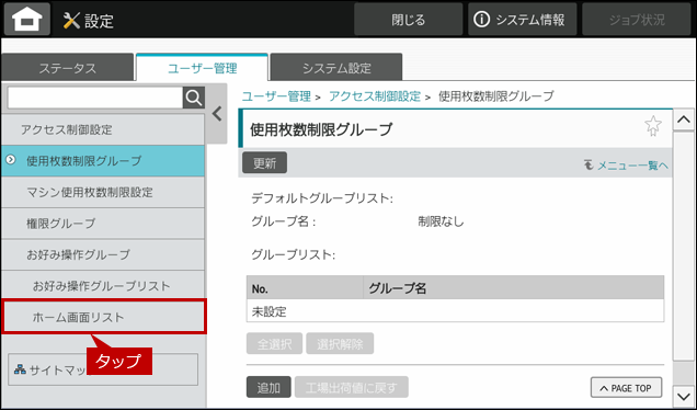 6. アクセス制御設定画面が表示されますので、[ホーム画面リスト]をタップします。