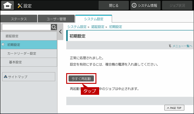 11. 「正常に処理されました。~」の画面が表示されましたら、[今すぐ再起動]をタップします。