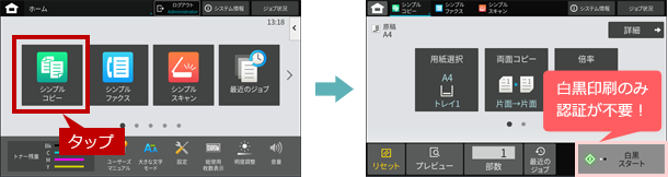 12. [シンプルコピー]をタップすると、[白黒]ボタンのみ表示されている事が確認できます。