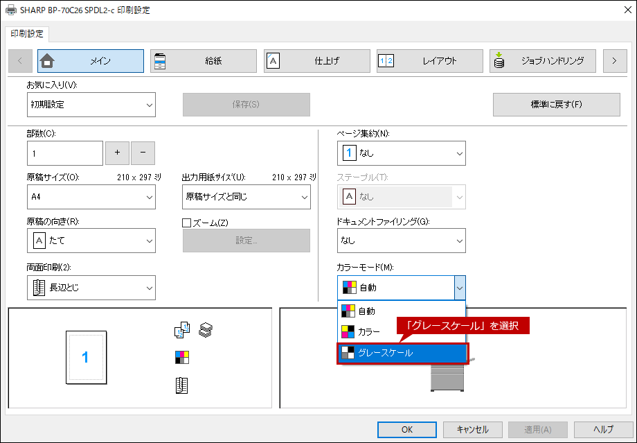 認証情報がなしの場合、プリンタードライバーのカラーモードは、必ず[グレースケール]を選択してください。 [自動]や[カラー]が選択されていると、データは送信されますが実際にプリントアウトはされません。