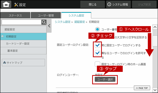 6. 画面を下へスクロールし、固定ユーザーログイン設定にある「常に固定ユーザーでログインする」と「異なるユーザーでのログインを許可する」にチェックを入れます。