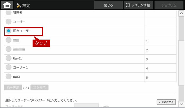 デフォルトユーザーである「固定ユーザー」のパスワードは、ユーザーズマニュアルに掲載しています。[システム設定(設定モード)]-[ユーザー管理]-[工場出荷時に登録されているユーザー]の表をご覧ください。ただし、固定ユーザーのパスワードは変更可能です。マニュアルに掲載しているパスワードで認証できない場合は変更されている可能性がありますので、複合機の管理者にお問い合わせください。