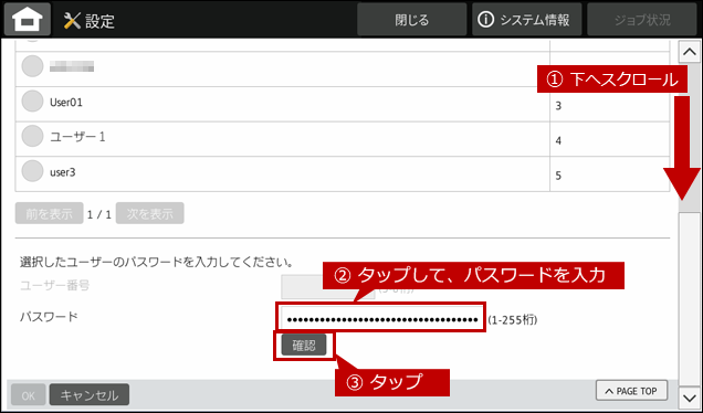 8. 画面を下へスクロールし、パスワードの入力エリアをタップします。「固定ユーザー」のパスワードを入力したら、[確認]をタップしてパスワードを照合します。