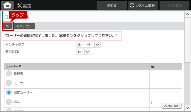 9. "ユーザーの確認が完了しました。..."と表示されたら[OK]をタップします。