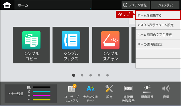 アイコンを登録したい場所に別のアイコン(機能)が登録されている場合は、本操作による登録ができません。事前に削除などを利用して空き状態にしておいてください。取りあえず空いている場所に登録し、後で表示順を変更することもできます。詳しい操作方法は「ホーム画面をカスタマイズしたい。」をご覧ください。
