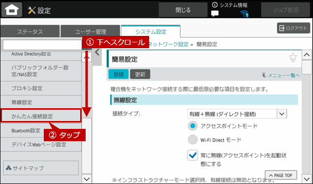 無線設定の詳細は「モバイル端末からルーターを経由せずに、ダイレクトに複合機と無線接続したい。」をご覧ください。