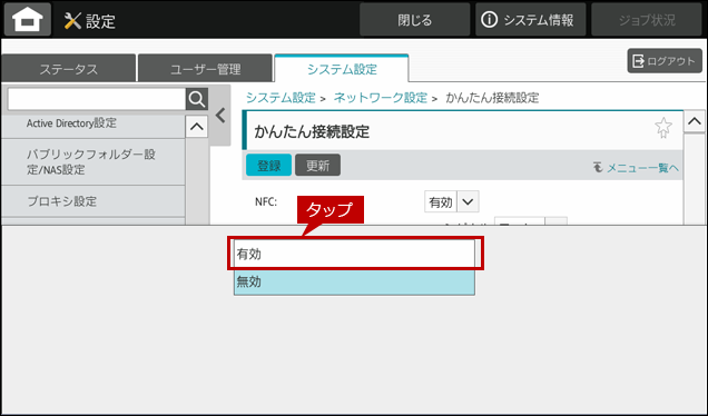 ●NFCが本体に標準装備されている場合、または、NFCリーダーライターが本体に接続されている場合は、NFCのプルダウンが表示されます。