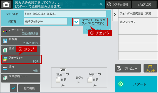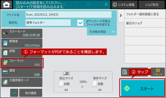 5.「スキャン保存」の基本画面に戻りますので、フォーマットが「PDF」になっていることを確認して[スタート]をタップします。