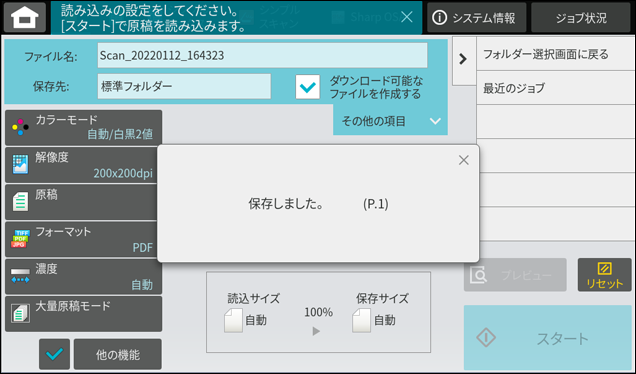 ※ここでは、スキャンしたデータを「標準フォルダー」へ保存します。