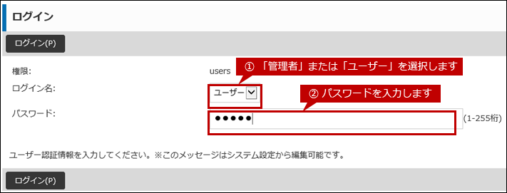 3. ログイン画面が表示されましたら、「管理者」または「ユーザー」でログインします。