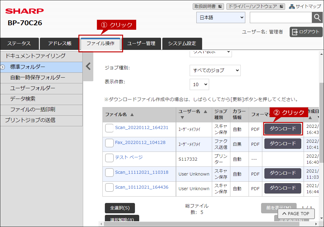 4. 複合機のWEBページが表示されましたら、[ファイル操作]をクリックした後、 標準フォルダーの「ファイルの選択」のページが表示されますので、ドキュメントファイリングしたファイル名の[ダウンロード]クリックします。