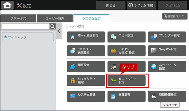省エネモードの設定は、システム設定の「省エネルギー設定」画面で変更することができます。