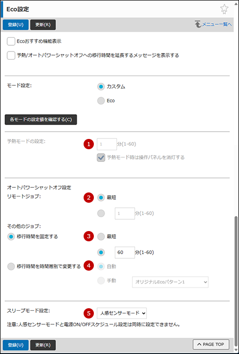 | ⑤ | スリープモード設定 | 例) 人感センサーモード | 省電力優先か復帰時間優先かを選択します。省電力優先では、省電力となりますが、復帰には多少時間がかかります。復帰時間優先では、省電力優先と比べて、電力値は多少上がりますが、復帰時間が早くなります。 |