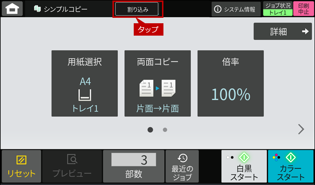 1. プリント中(トレイ1)に、[割り込み]をタップします。