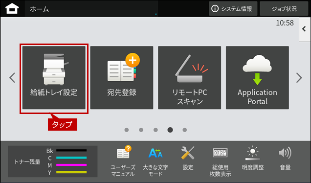 ※[給紙トレイ設定]ボタンがトップページにない場合は、ホーム画面を右にスクロールしてください。