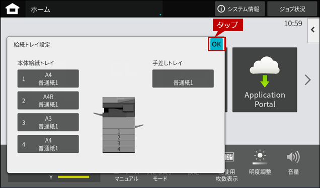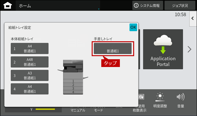 7. 「給紙トレイ設定」の最初の画面に戻りますので、[OK]をタップして、画面を閉じてください。