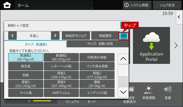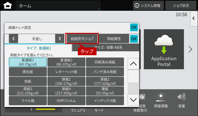 3. 「給紙トレイ設定」のメニュータブから[給紙許可ジョブ]をタップしてください。