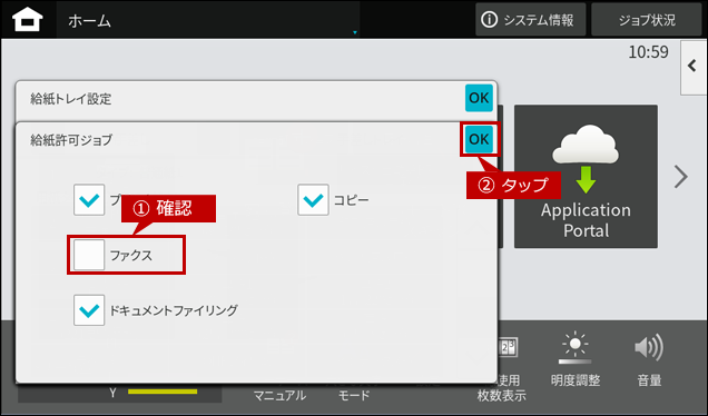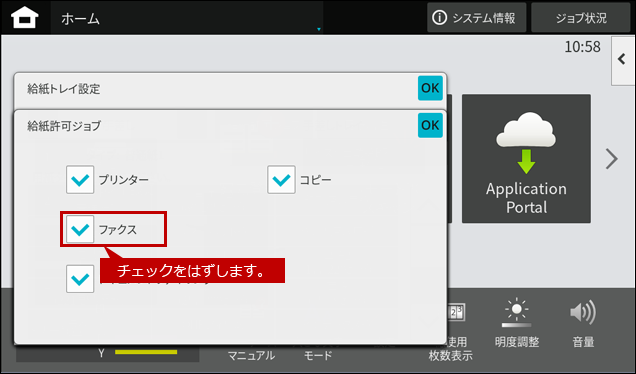 4. 「給紙許可ジョブ」画面が表示されますので、[ファクス]のチェックをはずしてください。