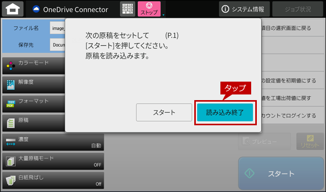 4. 原稿を読み込みましたら、「次の原稿をセットして[スタート]を押してください。原稿を読み込みます。」と表示されますので、次の原稿がある場合は原稿を入れ替えて[スタート]をタップします。次の原稿が無い場合は[読み込み終了]をタップします。