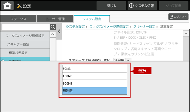 5. [送信データ上限値設定(FTP/デスクトップ/共有フォルダー]をタップします。