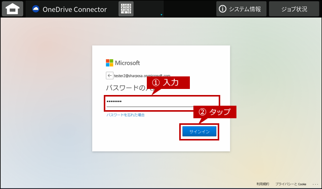 ・複合機のユーザー認証機能が有効な場合、1回目はログイン操作が必要になりますが、2回目以降のログイン操作は不要になります。(複合機のログインユーザーごとに「Office 365」のアカウント情報が紐付けされます。) |
