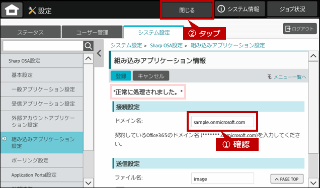 8. しばらくすると「正常に処理されました。」と表示されますので、ドメイン名が正しいことを確認し、[閉じる]をタップします。