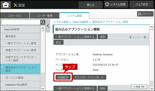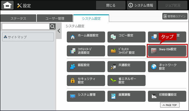2. 「システム設定」画面が表示されますので、[Sharp OSA設定]をタップします。