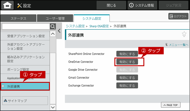 3. 「SharpOSA」の画面が表示されますので、[外部連携]をタップして、「OneDrive Connector」の[有効にする]をタップします。