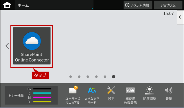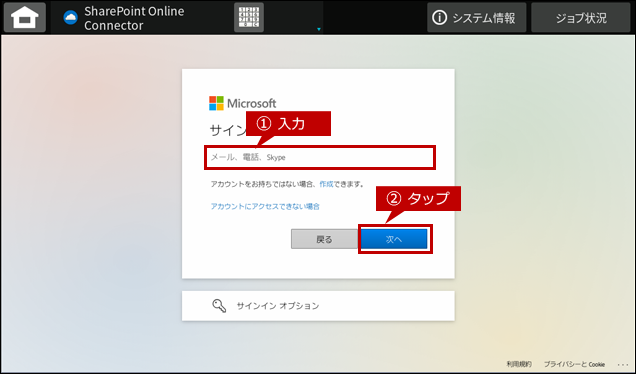 ・複合機のユーザー認証機能が有効な場合、1回目はログイン操作が必要になりますが、2回目以降のログイン操作は不要になります。(複合機のログインユーザーごとに「Office 365」のアカウント情報が紐付けされます。) |