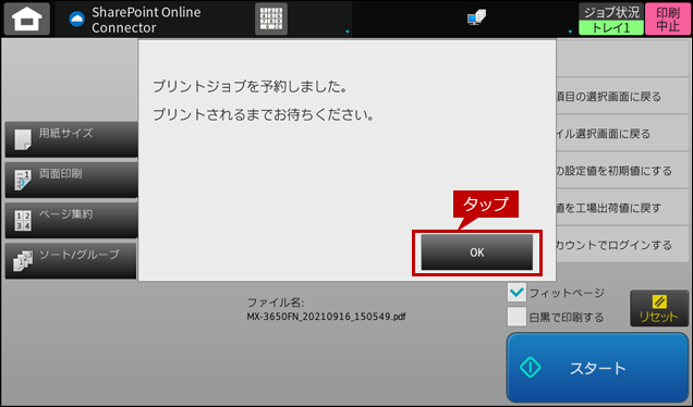 5. 「プリントジョブを予約しました。プリントされるまでお待ちください。」のダイアログが表示されましたら、[OK]をタップします。