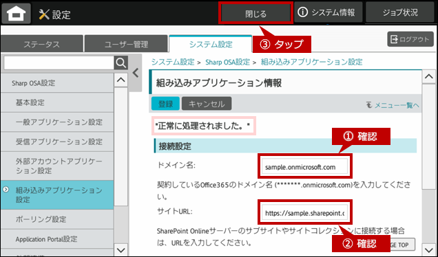 8. しばらくすると「正常に処理されました。」と表示されますので、ドメイン名、サイトURLが正しいことを確認し、[閉じる]をタップします。