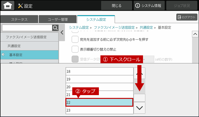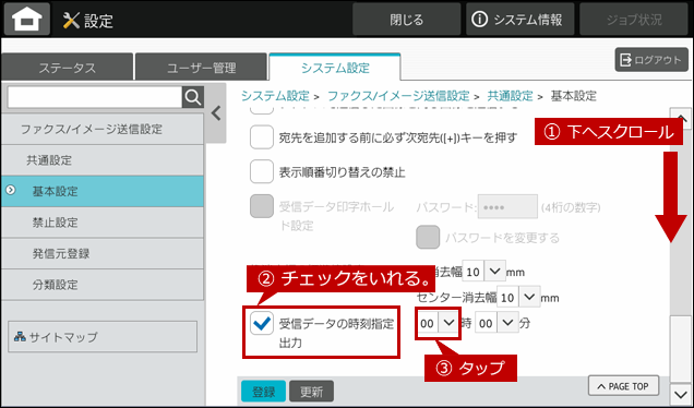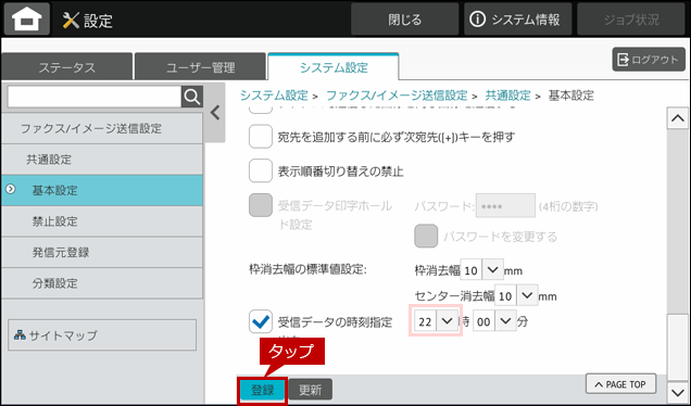 本ページでは、受信ファクスを夜間の10時に一括印刷する設定方法を例にご説明します。