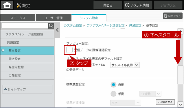 6. 画面を下へスクロールし、[プレビュー設定]にある[受信データの画像確認設定]のチェックボックスをタップして、チェックを入れます。