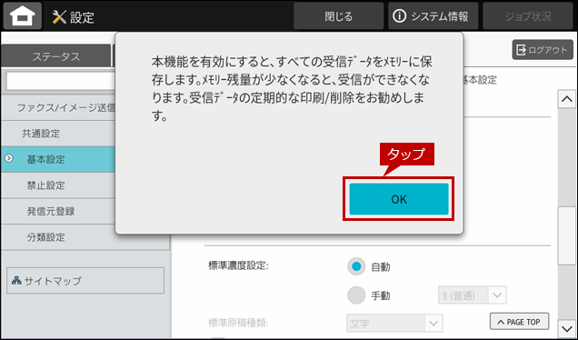 7. 「本機能を有効にすると、すべての受信データをメモリに保存します。~」のダイアログ画面が表示されましたら、[OK]をタップします。