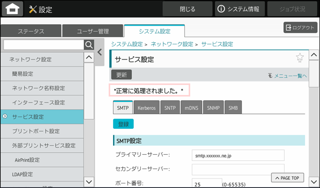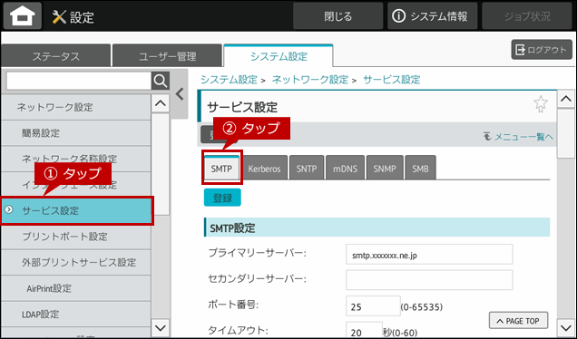 4. ネットワーク設定画面が表示されますので[サービス設定]をタップして、[SMTP]タブをタップします。