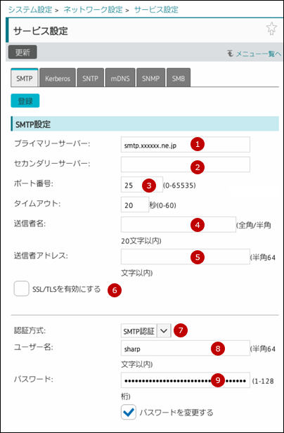 SMTP認証が有効時はSMTPサーバーのユーザー名(アカウント名)を入力します。例)sharp - ⑨ パスワード:SMTP認証が有効時は⑧のユーザー(アカウント)のパスワードを入力します。