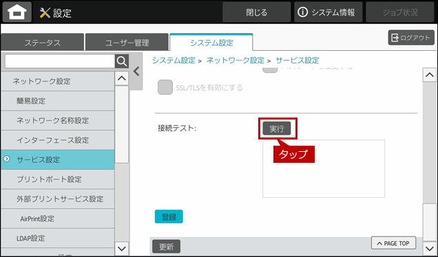 7. ページを下にスクロールして、接続テストの[実行]をタップします。