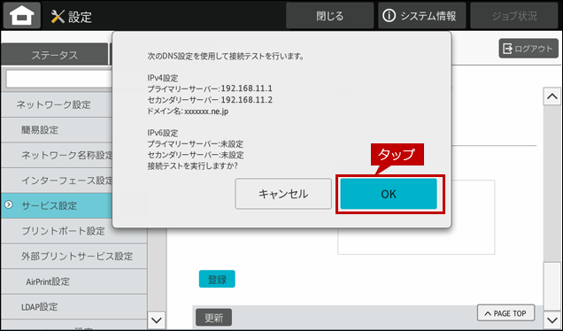 8. 「次のDNS設定を使用して接続テストを行います。」のダイアログ画面が表示されますので、[OK]をタップします。