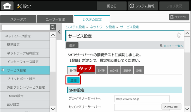 9. 接続テストに成功しますと、「SMTPサーバーへの接続テストに成功しました。[登録ボタン]で、設定を反映してください。」と表示されますので、[登録]をタップします。
