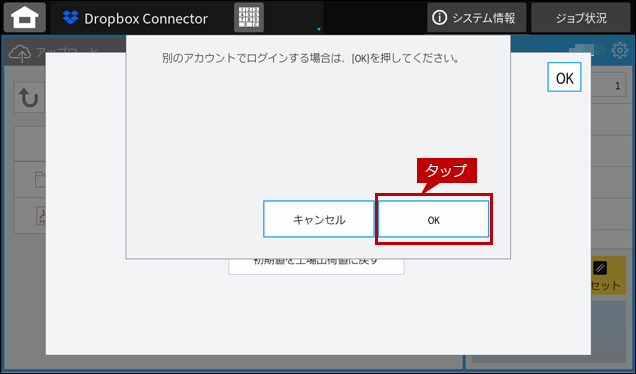 3. 「別のアカウントでログインする場合は[OK]を押してください。」のダイアログ画面が表示されますので[OK]をタップします。